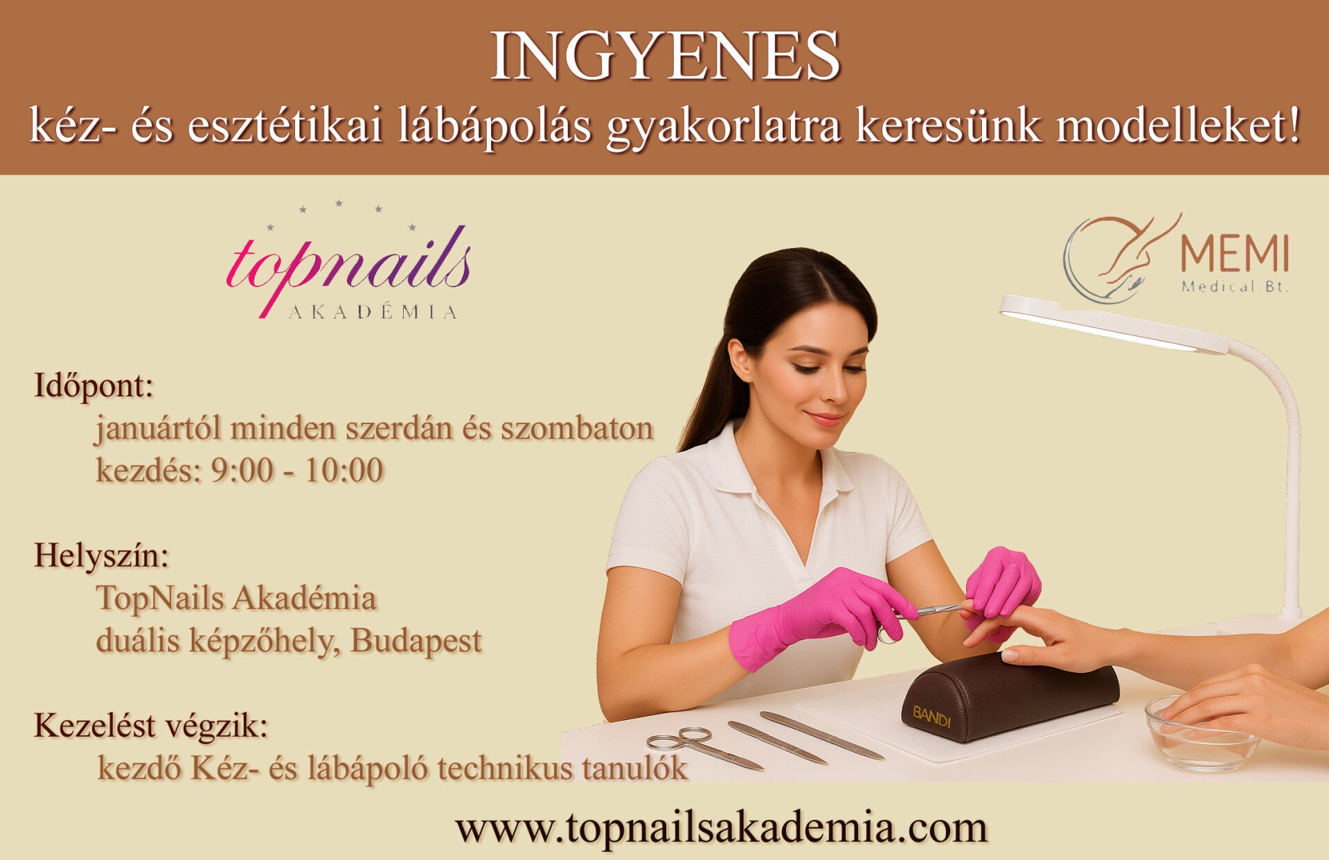 A MEMI Medical Bt.Topnails Akadémiája kézápoló- és körömkozmetikus, speciális lábápoló szakmai oktatásokat/képzéseket, valamint szakmai továbbképzéseket oktató képzőhely/ duális képzőhely Budapesten. Az oktatásaink alatt olyan szakembereket nevelünk a szépségipar számára, akik a sikeres vizsgájukat követően kézzelfogható tudással kerülnek ki a munkaerő piacra és azonnal önálló